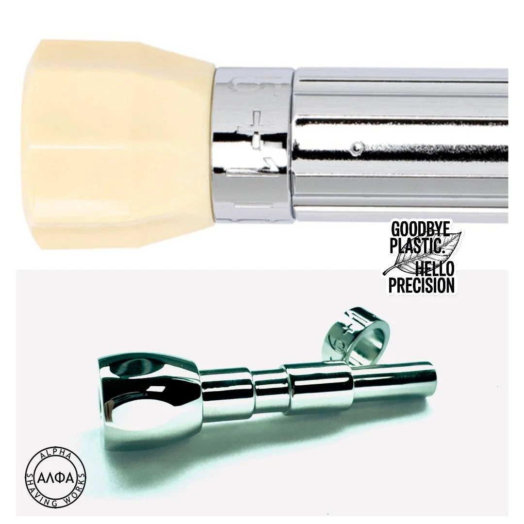 Coming soon... Meet The AlphaGress: A machined solid brass upgrade, nickel-plated to match the razor’s body.